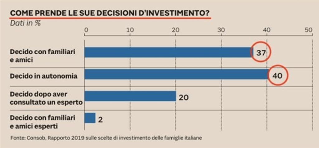 Da una ricerca Consob 2019, riportata da “Il Sole 24 Ore”, emerge che 8 Italiani su 10 decidono in autonomia o, seguendo il consiglio di famigliari o amici. Solo 2 dopo aver consultato un esperto.