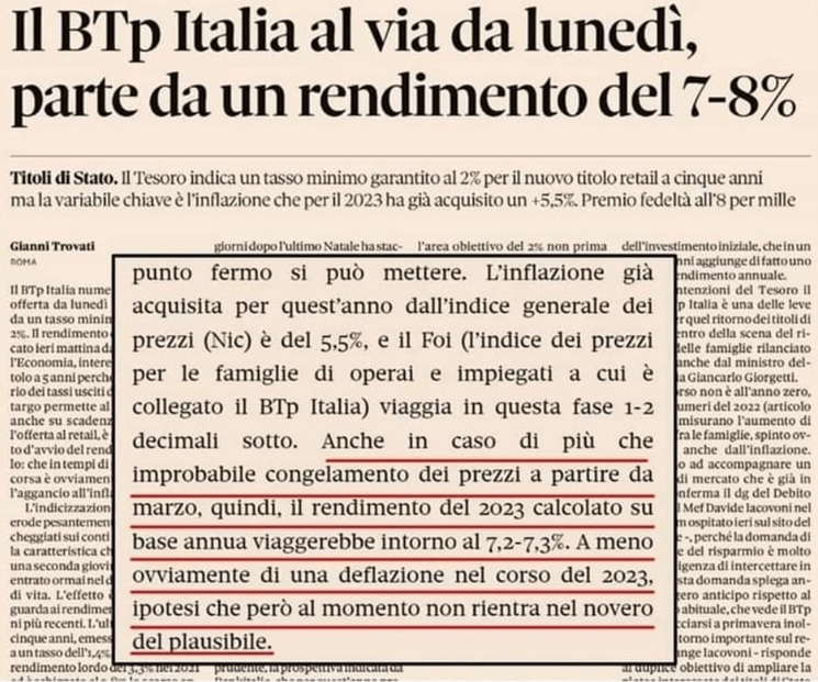 Marzo 2023: lo stato italiano, in piena bagarre inflazione, colloca il Btp Italia, un titolo quinquennale che, con una cedola minima stabilità del 2% annuo, per gli addetti ai lavori, “parte” da un rendimento del 7-8%. La richiesta dei risparmiatori è stata elevatissima e, non poteva essere da meno, dato che media (sotto l’articolo del sole 24 Ore) ed analisti esaltavano i rendimenti “miracolosi” di questo titolo. Come rinunciarvi, dopo anni di titoli obbligazionari con rendimenti vicini allo zero e, dopo l’elevata volatilità che aveva dominato i mercati finanziari nel 2022?